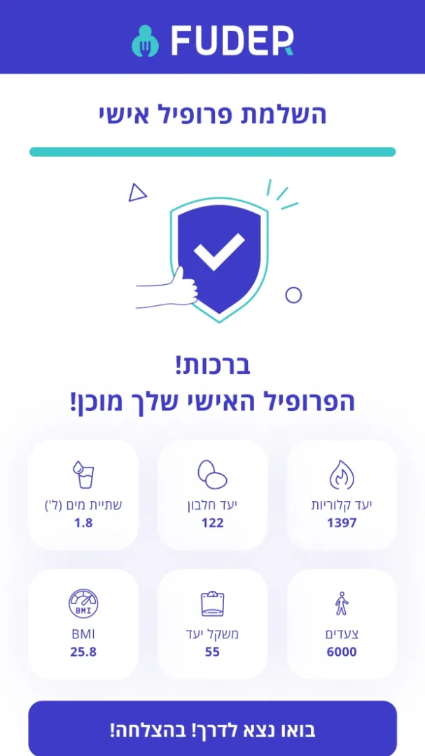 - התאמה אישית ליעד: הגדרת משקל היעד והתאריך, וקבלת תקציב קלורי יומי מדויק כדי להגיע לשם בזמן.